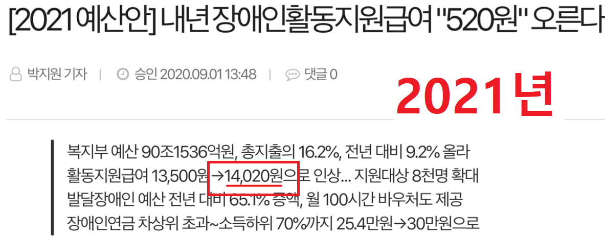 2020년에는 장애인활동보조인 시급이 13,500원으로 책정이 되었고, 2021년 올해는 14,020원으로 올랐습니다.