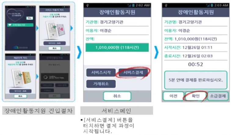 현재는 지원사분들이 이용인(장애인)분들 집에 방문하면, 바우처 단말기를 이용해서 출근 도장을 찍듯이 이용인 분들이 바우처 한도 내에서 결제를 합니다. 그러면 금액이 센터로 보내지고 센터에서 지원사분들에게 급여를 제공하는 방식으로 운영됩니다.