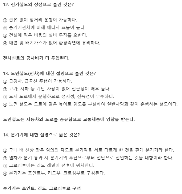 오늘은 2021년 철도토목기사(철도보선기사) 필기 기출문제 풀이를 소개합니다. 이 글에선 1과목 철도공학 풀이만 소개하겠으며, 2과목 측량학, 3과목 응용역학은 비슷한 회차 토목기사와 똑같습니다. 측량학, 응용역학 두 과목 공부를 위해선 교재 구매를 추천합니다. 필기 시험에 합격하고 실기를 준비하신다면 아래 실기 기출문제 풀이에 중요한 457개 요소 정리된 글도 함께 읽어보는 걸 추천합니다.
