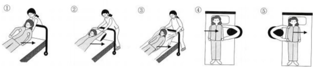 6. 누워있는 대상자가 오른쪽으로 쏠려있을 때 침대 중앙으로 이동시키는 방법으로 옳은 것은?