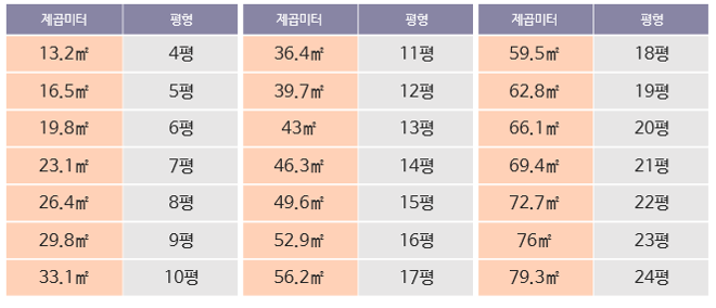 같은 방법으로 84m2 제곱미터를 계산하면 약 24평이 나오죠.