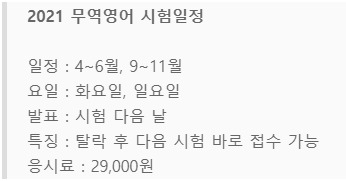 여기까지 2021 무역영어 시험일정 및 시험에 대한 설명이었고요. 상시 시험으로 전환됐기 때문에 기출문제가 더는 공개되지 않습니다. 공부 방법은 기존 기출문제, 기존 3년 치, 4년 치 기출문제를 참고하여 공부하시면 됩니다. 상시 시험으로 전환됐기에 떨어지더라도 바로 다음 주 시험에 응시할 수 있어서 계속 보다 보면 좋은 결과가 있으리라 생각합니다.