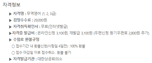 응시자격은 없고 응시료는 29,000원이고 자격증 발급비용 3,100원은 별도로 추가됩니다. 자격증 발급 기관은 상공회의소고요. 그렇기 때문에 무역영어는 무역자격증 중에 가장 대표적인 국가공인 자격증이 됩니다.