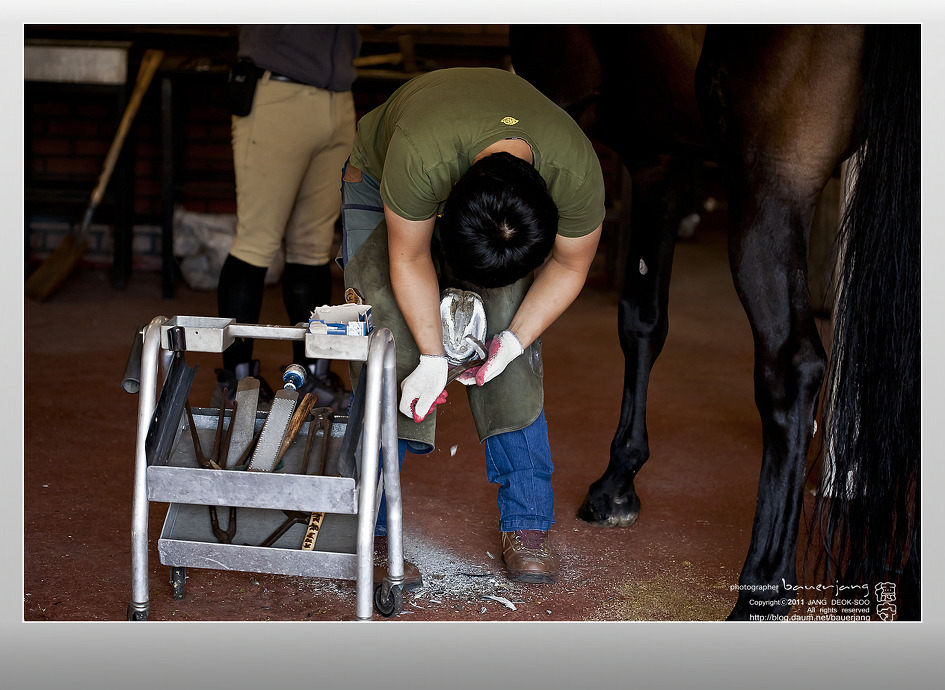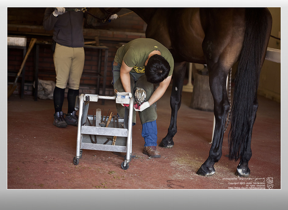 선택한 편자나 제작한 편자를 말의 발굽에 장착하는 것은 그 다음의 일입니다. 이때에는 많은 힘이 요구됩니다. 왜냐하면 편자를 장착하기 위해서는 말의 다리를 들어서 굽을 젖혀야 하는데, 이를 위해서는 약 20~25㎏정도의 무게를 드는 것과 같은 힘이 요구된답니다. 그래서 이 때는 말의 소유주나 말을 다루는 조교와 함께 힘을 합하기도 합니다.