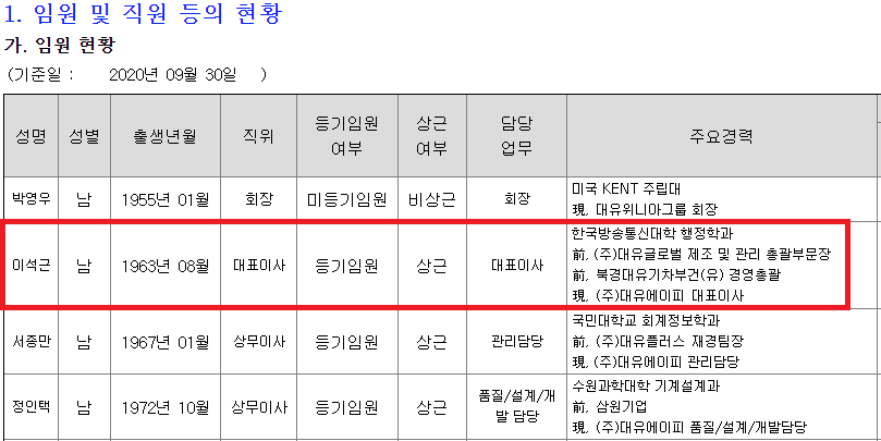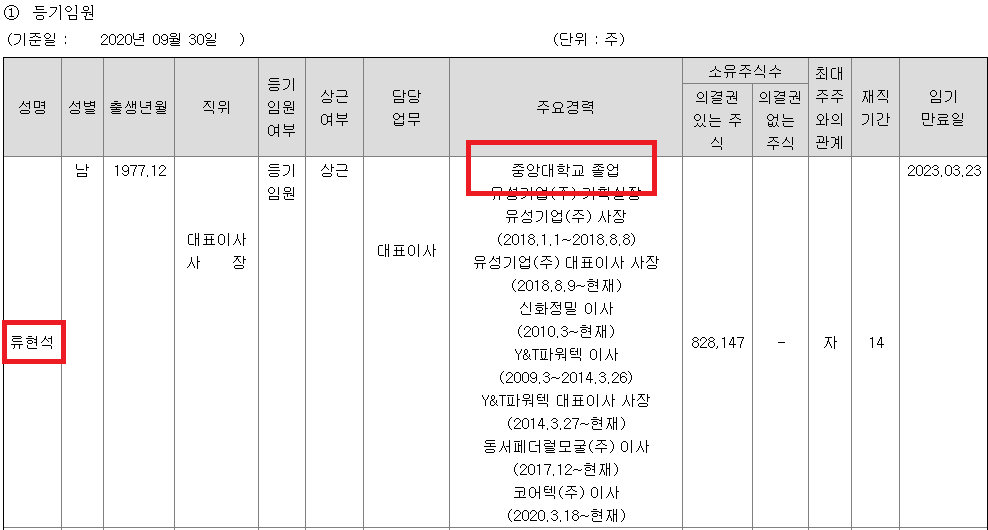 유성기업. 유성기업 대표이사 류현석 사장님께선 중앙대학교를 졸업하셨습니다. 어떻게 보면 성안과 유사한 재료인데 성안은 부사장님께서 중앙대학교를 졸업하셨고, 유성기업은 사장님, 대표이사께서 중앙대학교를 졸업하셨습니다.