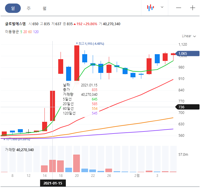 글로벌에스엠은 1월 중순에 성안처럼 상한가를 기록했는데요.