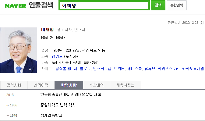 우선, 대선에 도전할 확률이 높은 이재명 도지사의 학력 사항을 볼 필요가 있습니다.