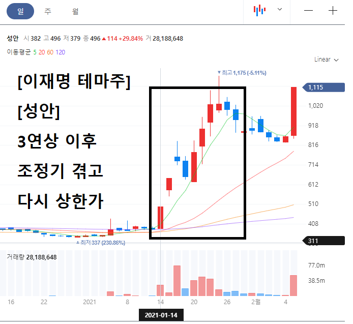 아래는 성안 차트인데요. 지난 1월 14일 이후 3연상 이후 조정기를 거쳐 다시 상한가를 기록하는 중입니다.