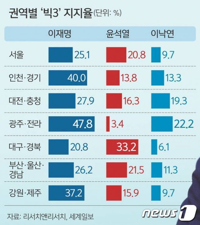 오늘의 주제는 이재명 테마주 숨은 종목 찾아보기입니다. 관련주 찾아보기 전에 일단 기사 하나를 보고 갈건데요. 동아일보 기사입니다. 지난 1월 31일 권역별 빅3 지지율을 조사해 보니 대구 경북을 제외한 모든 지역에서 이재명 도지사가 차기대선 선호도에서 압도적인 1위를 기록했습니다.