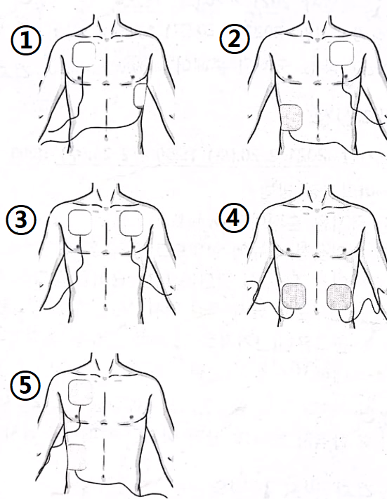 79. 자동심장충격기 사용 시 전극 패드를 붙이는 위치로 옳은 것은? 1번