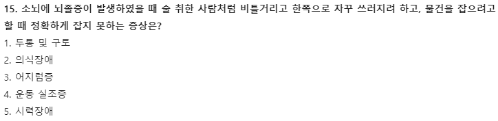 15. 소뇌에 뇌졸중이 발생하였을 때 술 취한 사람처럼 비틀거리고 한쪽으로 자꾸 쓰러지려 하고, 물건을 잡으려고 할 때 정확하게 잡지 못하는 증상은?