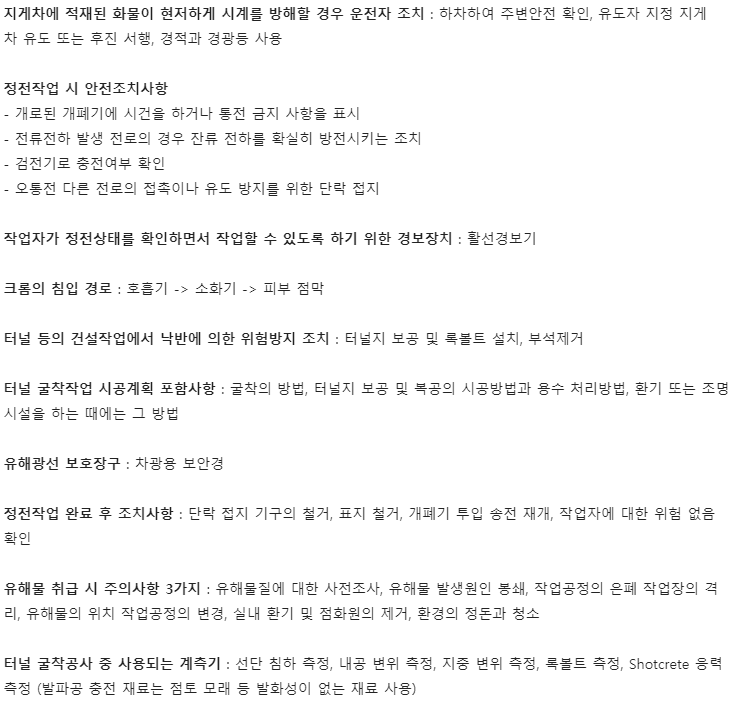 터널 굴착공사 중 사용되는 계측기 : 선단 침하 측정, 내공 변위 측정, 지중 변위 측정, 록볼트 측정, Shotcrete 응력 측정 (발파공 충전 재료는 점토 모래 등 발화성이 없는 재료 사용)