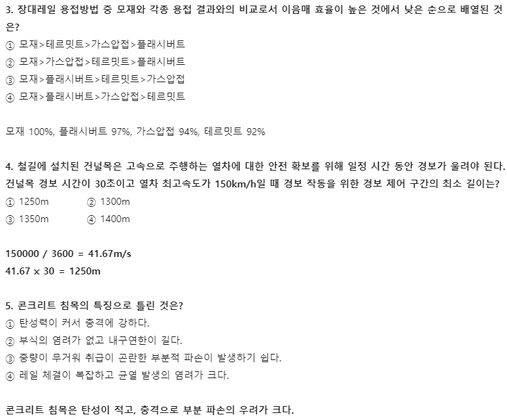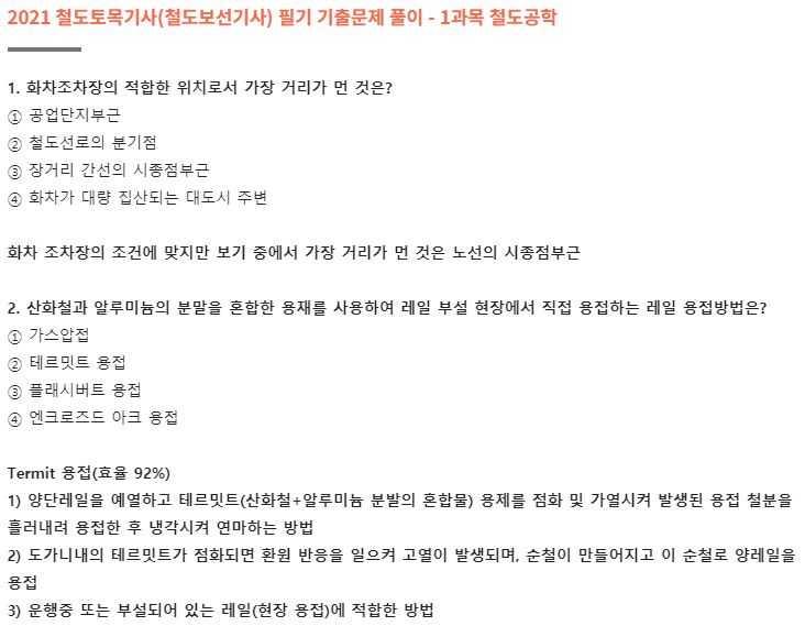 오늘은 2021년 철도토목기사(철도보선기사) 필기 기출문제 풀이를 소개합니다. 이 글에선 1과목 철도공학 풀이만 소개하겠으며, 2과목 측량학, 3과목 응용역학은 비슷한 회차 토목기사와 똑같습니다. 측량학, 응용역학 두 과목 공부를 위해선 교재 구매를 추천합니다. 필기 시험에 합격하고 실기를 준비하신다면 아래 실기 기출문제 풀이에 중요한 457개 요소 정리된 글도 함께 읽어보는 걸 추천합니다.