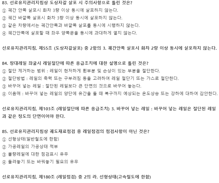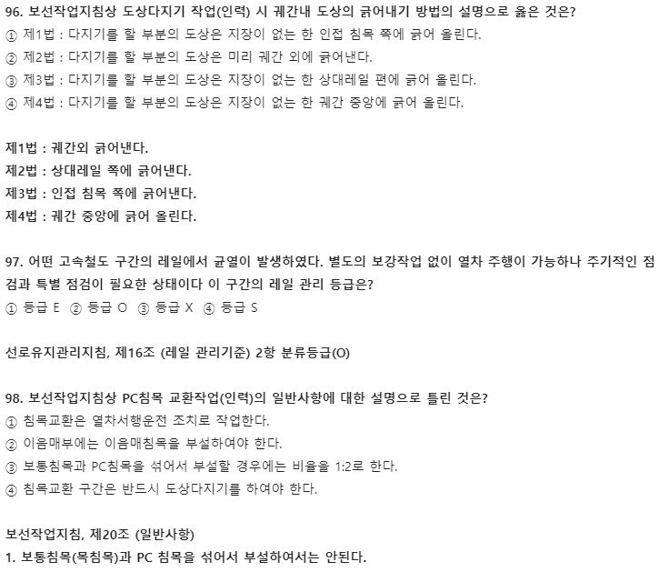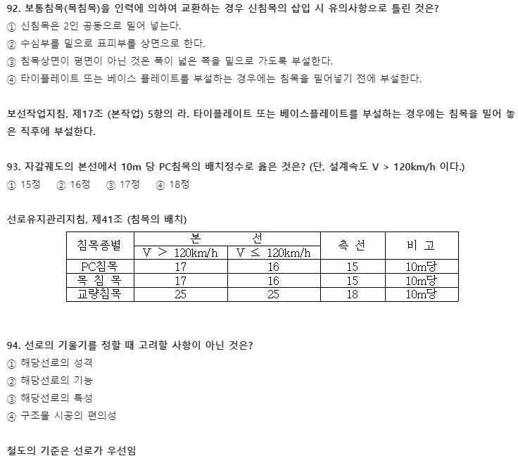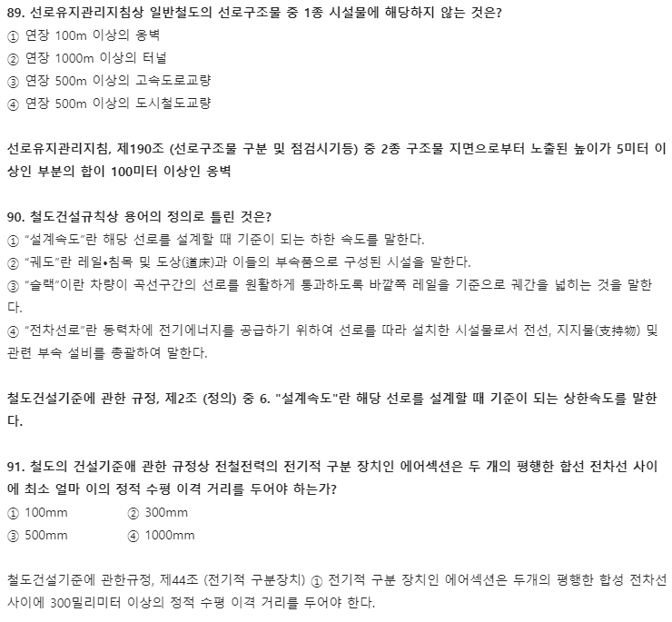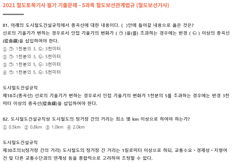 오늘은 2021년 철도토목기사(철도보선기사) 필기 기출문제 풀이를 소개합니다. 이 글에선 5과목 철도보선관계법규 풀이만 소개하겠으며, 2과목 측량학, 3과목 응용역학은 비슷한 회차 토목기사와 똑같습니다. 측량학, 응용역학 두 과목 공부를 위해선 교재 구매를 추천합니다. 필기 시험에 합격하고 실기를 준비하신다면 아래 실기 기출문제 풀이에 중요한 457개 요소 정리된 글도 함께 읽어보는 걸 추천합니다.