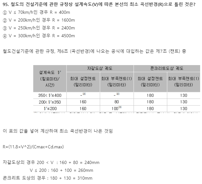 95. 철도의 건설기준에 관한 규정상 설계속도(V)에 따른 본선의 최소 곡선반경(R)으로 틀린 것은?