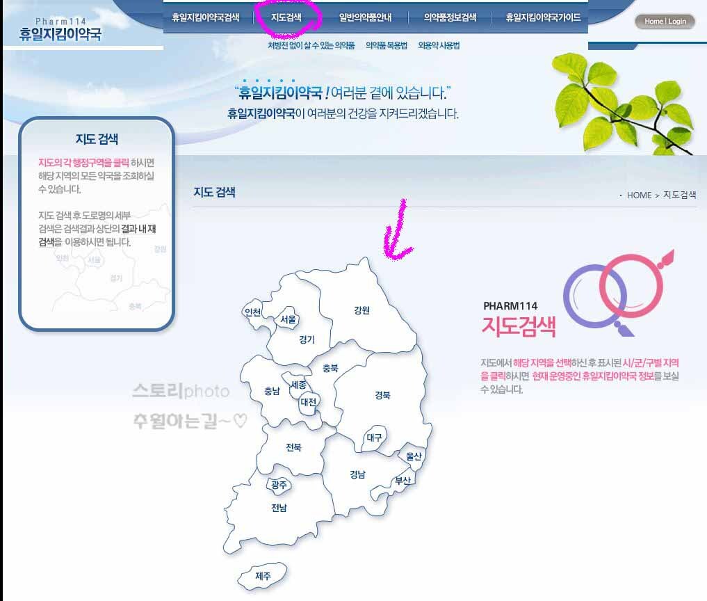 상단 카테고리를 보면 지도검색이라고 있습니다 기본 검색으로 약국을 찾아도 되지만 큼지막하게 보이는 지도로 보니 더욱 쉬워 보입니다.