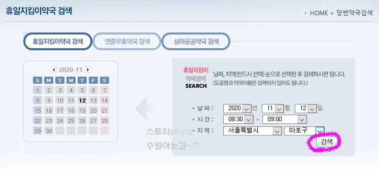 예시로 날짜와 시간 지역을 선택해 주었습니다 서울 마포구의 약국을 한번 알아보겠습니다. 선택을 완료했다면 검색을 눌러 줍니다.