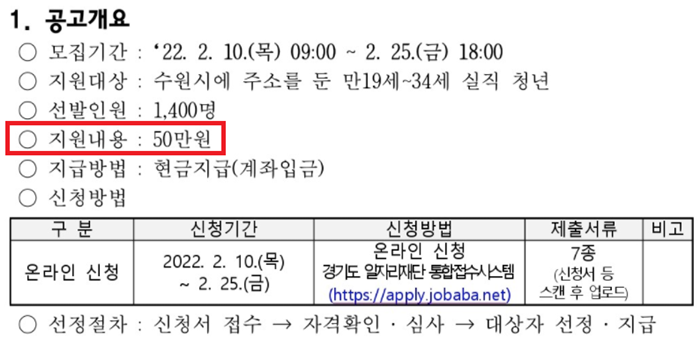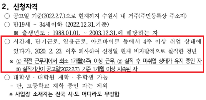 수원시는 단기근로, 일용근로, 아르바이트 등에서 4주 이상 취업 상태에 있다가, 2020년 2월 23일 이후 퇴사하여 신청일 현재 비자발적으로 실직한 청년이 대상입니다. 나이는 만 19세에서 34세 이하 청년에게 50만원을 지급합니다. 공고일은 2022년 2월 7일로 현재까지 수원시 내 거주(주민등록상 주소기)해야 하며, 실직 기간이 공고일 2022년 2월 7일 기준 1개월 이상 지속되어야 합니다. 2월 10일(목)부터 25일(금)까지 경기도 일자리 재단 통합 접수 시스템에서 신청하시면 되고요.