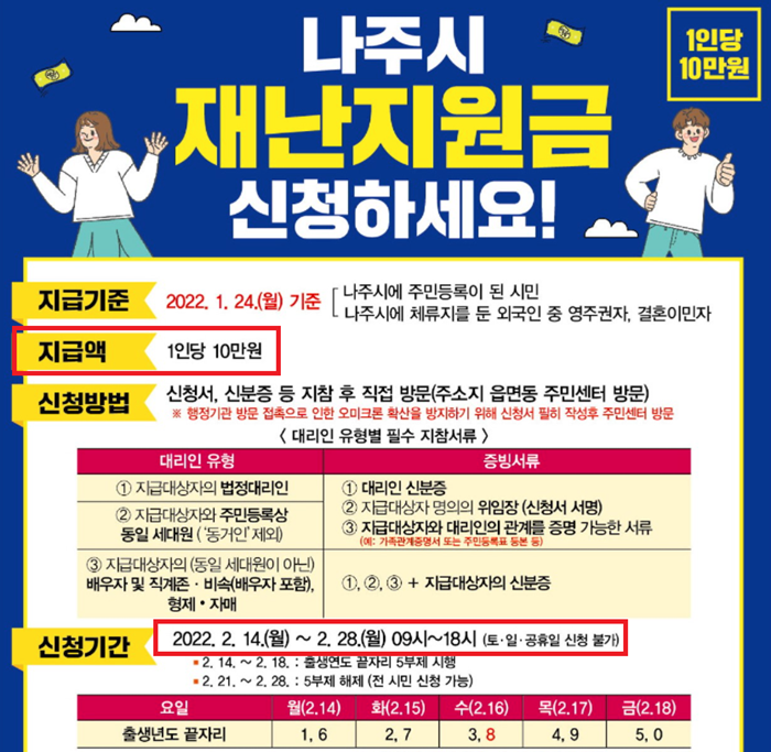 2022년 1월 24일부터 나주시 관내에 주민등록이 되어 있다면, 2월 14일부터 28일까지 신청할 수 있는데요. 나주 사랑 상품권 1인당 10만원을 받을 수 있습니다.