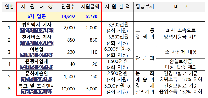 창원시는 법인택시, 전세버스 운수종사자, 여행업을 비롯한 관광사업체, 특수 형태 근로 종사자와 프리랜서 등이 지원받을 수 있습니다. 법인택시, 전세버스 운수 종사자 같은 경우에는 방역지원금은 1인당 100만원을 10일부터 23일까지 접수받은 후 심사를 거쳐 2월 말부터 지급할 예정입니다.