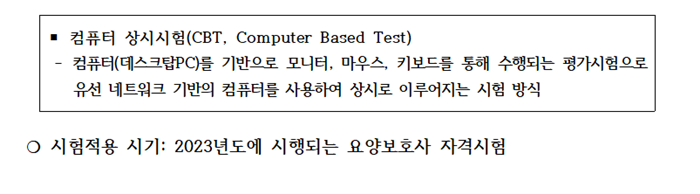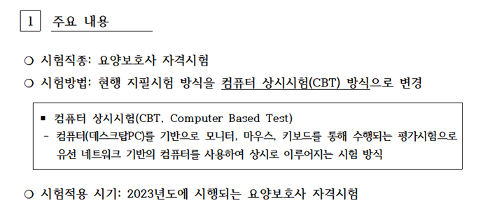 시험 직종은 요양보호사 자격시험입니다. 여기에서 현행 지필시험 방식을 컴퓨터 상시 시험 방식으로 변경하겠다 이렇게 밝혔습니다. 그리고 컴퓨터 상시 시험 방식이라는 것은 일정한 날짜에 장소와 시간을 정해서 시험을 보는 것이 아니라 언제든지 누구나 요양보호사가 되겠다고 하는 분들은 항상 시험을 볼 수 있도록 하겠다!!! 그러니까 응시자의 시간에 맞춰서 시험을 매일 볼 수 있도록 하겠다고 바뀌는 것인데요.