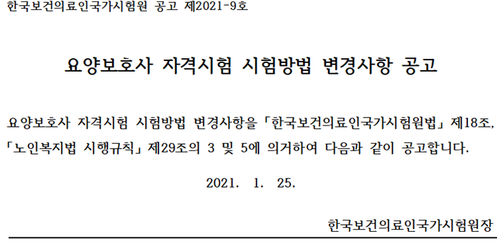 이 내용은 1년 전에 나왔던 내용인데 잘 알려져 있지 않습니다. 요양보호사 자격시험 방법 변경 사항을 한국 보건의료인 국가시험원(국시원)에서 국가시험은 법제 18조 노인복지법 시행규칙 제29조에 3 및 5에 의거하여 다음과 같이 공고합니다. 이렇게 밝혔는데요. 주요 내용을 한번 살펴보겠습니다.