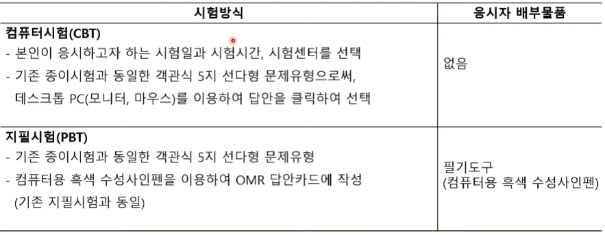 CBT 컴퓨터 시험은 컴퓨터 본체에서 본인을 인식하면 모니터 화면 문제가 뜨고요. 다음에 시험지 문제들이 모니터에 보이기 때문에 마우스 조작만으로 시험을 치를 수 있습니다. 그래서 응시자 배분 물품은 별도로 없고요.
