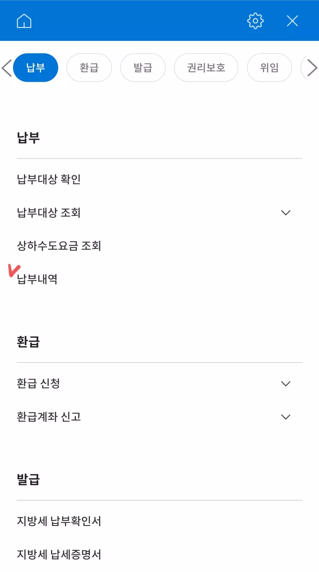 2. 우측 상단의 [三] – [납부] – [납부내역]을 선택합니다.