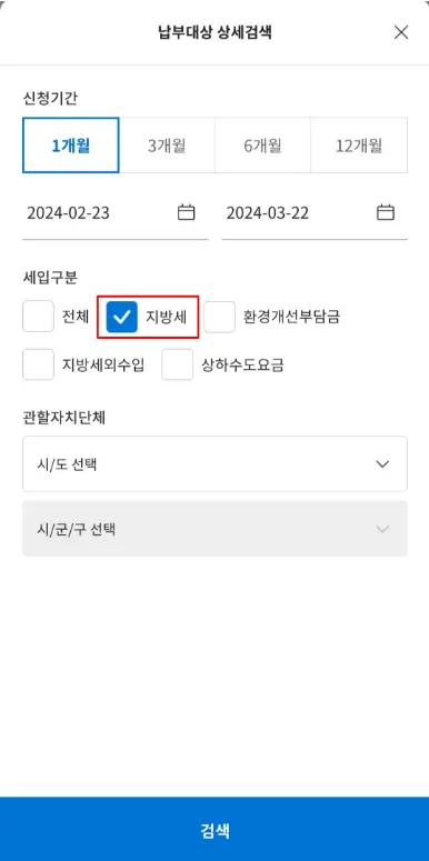 4. [상세검색]을 누른 후, 조회하고자 하는 기간과 관할자치단체를 입력합니다. 그리고 세입구분에 “지방세”를 선택한 후 [검색]을 누릅니다.