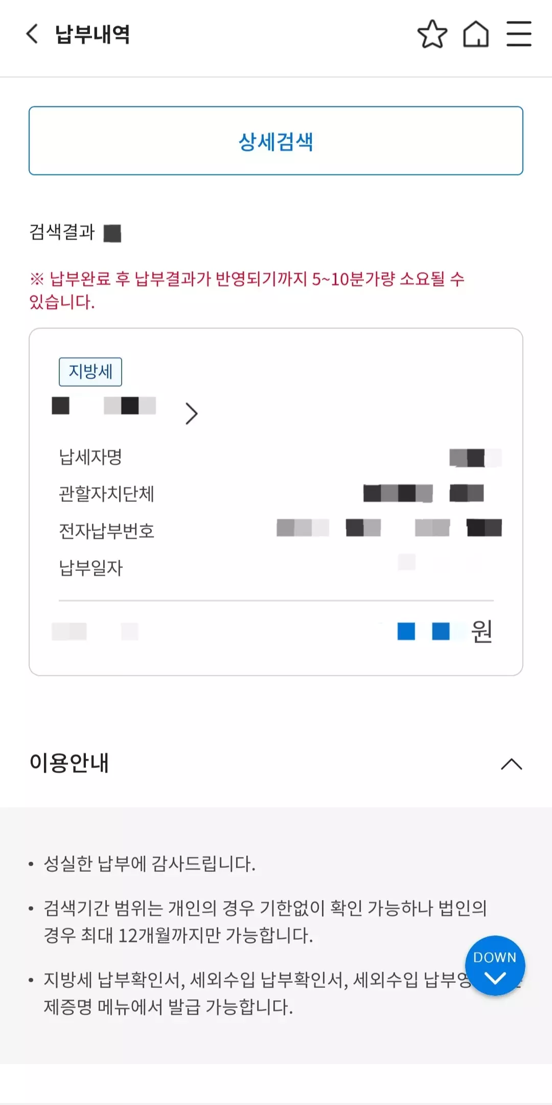 5. 납부가 완료된 경우, 자동차세 납부 내역을 확인할 수 있습니다. 납부일자, 납세자명, 납부금액, 관할자치단체, 전자납부번호가 표시됩니다.