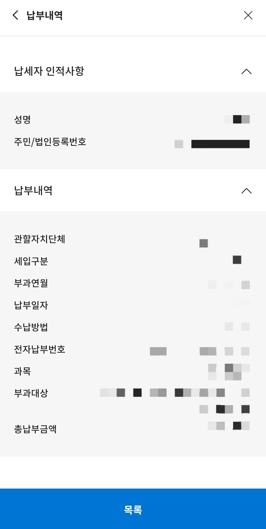 6. 전자납부번호를 클릭하면 상세 내용을 볼 수 있습니다. (납세자 인적사항, 부과대상 등)