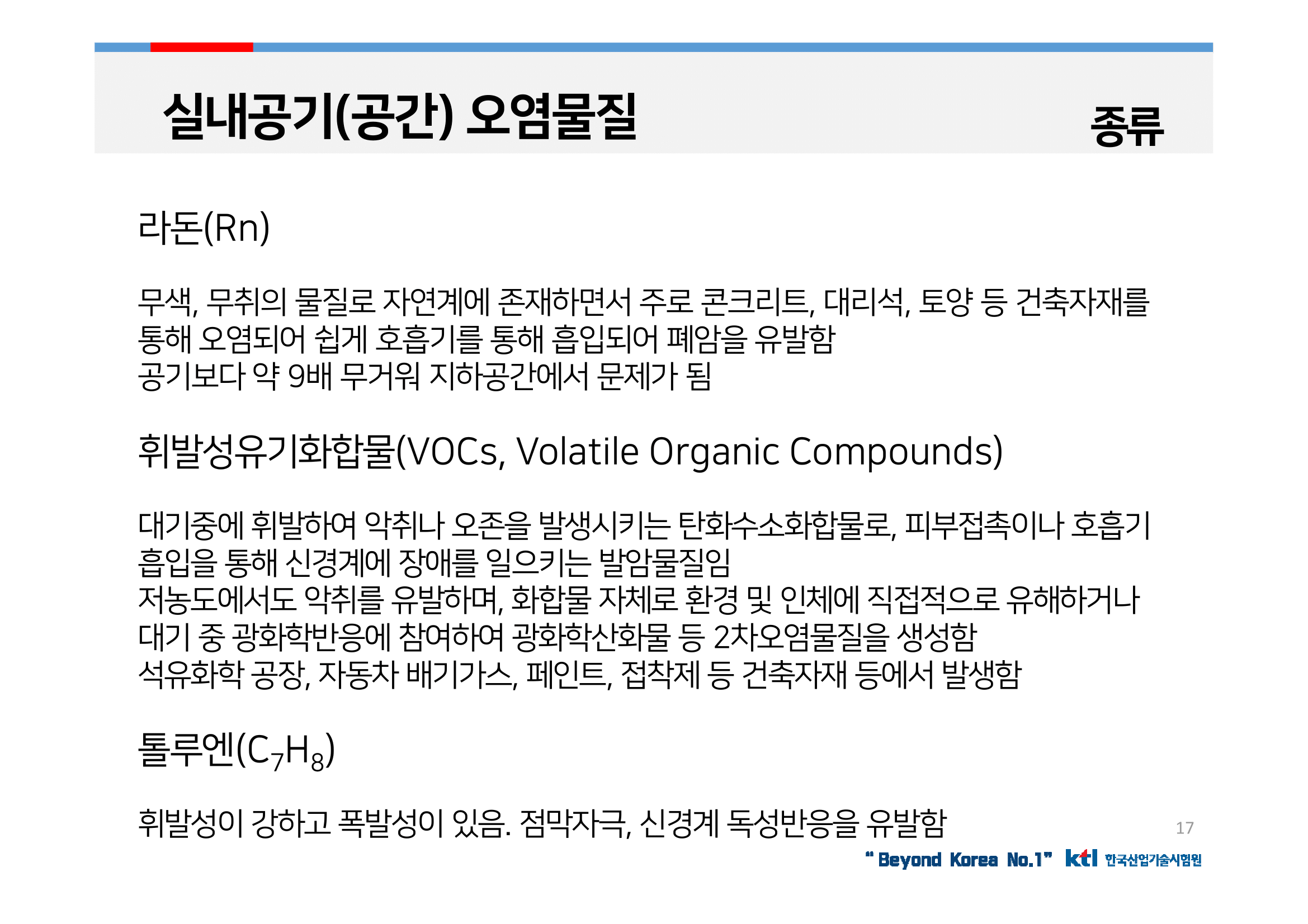 다양한 건축자재 및 단열재, 생활용품 등에서 오염물질이 방출될 수 있으나 인체의 신체감각은 독성 감지에 둔감하므로 이러한 실내공기 오염에 대한 감지능력이 떨어짐.