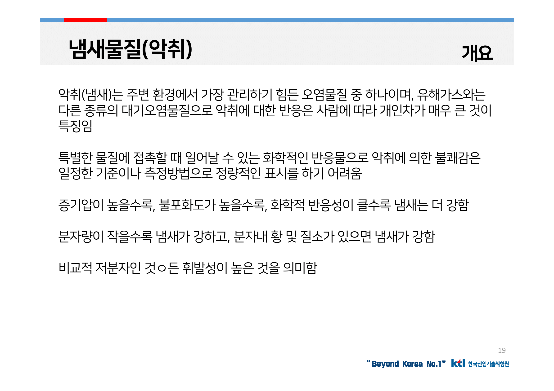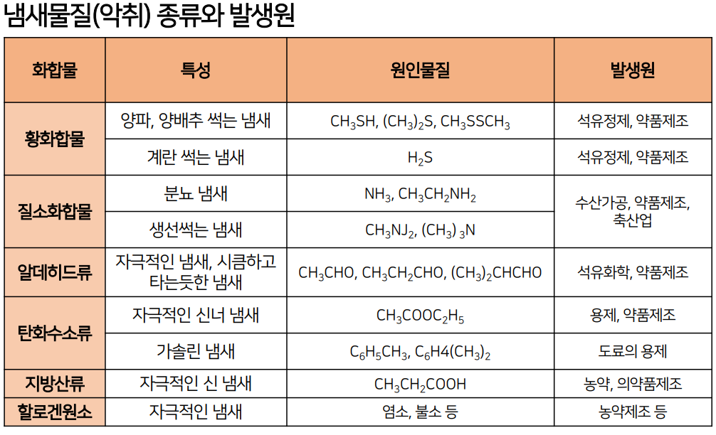 악취(냄새)는 주변 환경에서 가장 관리하기 힘든 오염물질 중 하나이며, 유해가스와는 다른 종류의 대기오염물질으로 악취에 대한 반응은 사람에 따라 개인차가 매우 큰 것이 특징임.