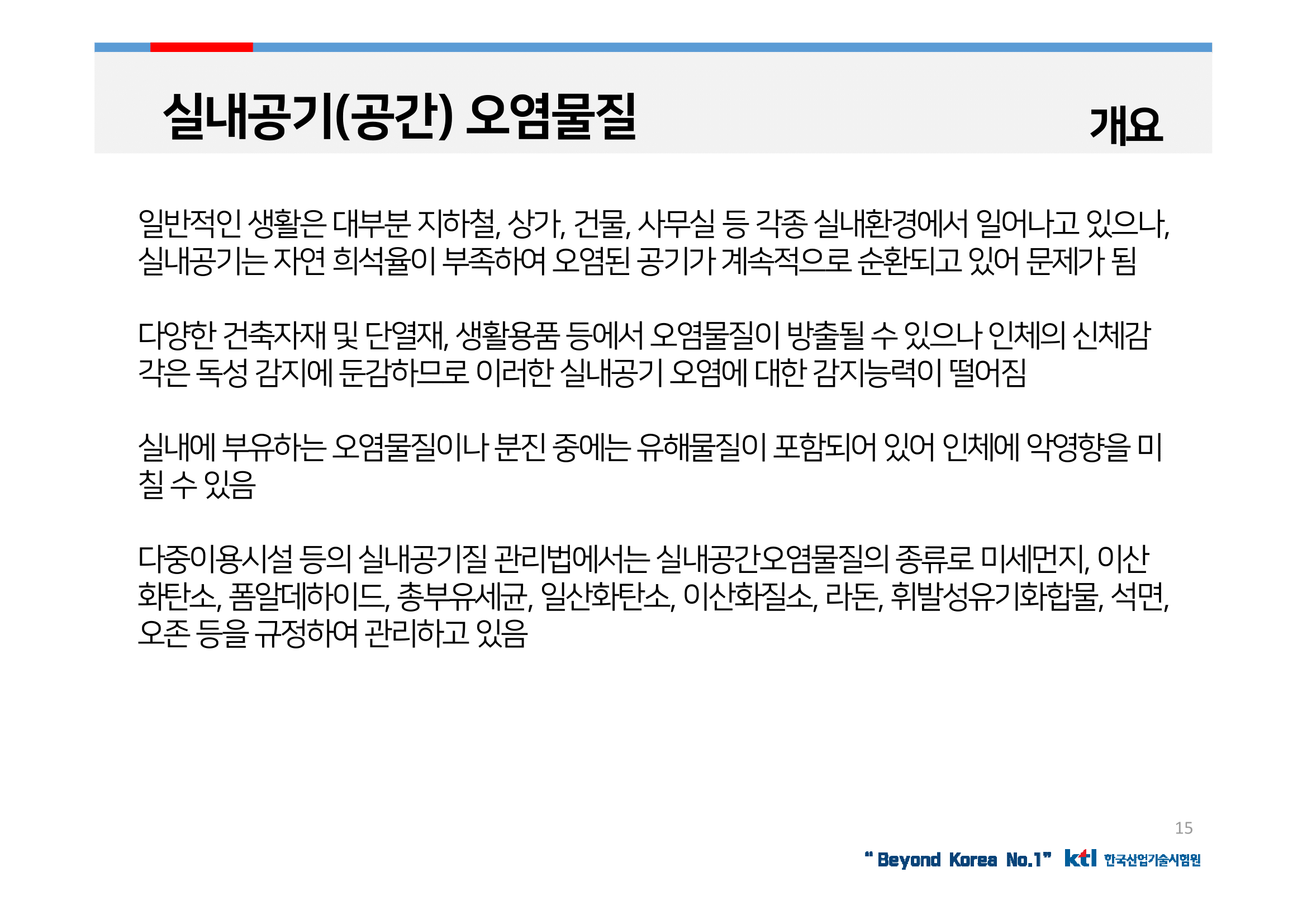 일반적인 생활은 대부분 지하철, 상가, 건물, 사무실 등 각종 실내환경에서 일어나고 있으나, 실내공기는 자연 희석율이 부족하여 오염된 공기가 계속적으로 순환되고 있어 문제가 됨.