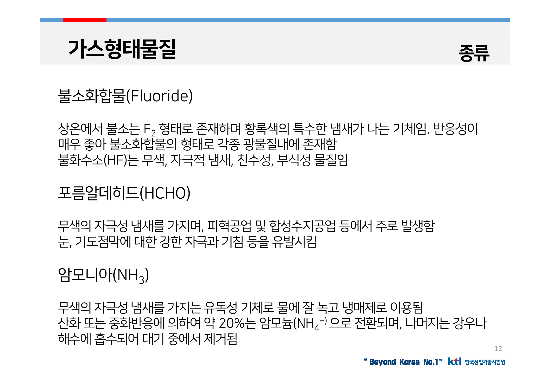 무색의 자극성 냄새를 가지며, 피혁공업 및 합성수지공업 등에서 주로 발생함. 눈, 기도점막에 대한 강한 자극과 기침 등을 유발시킴