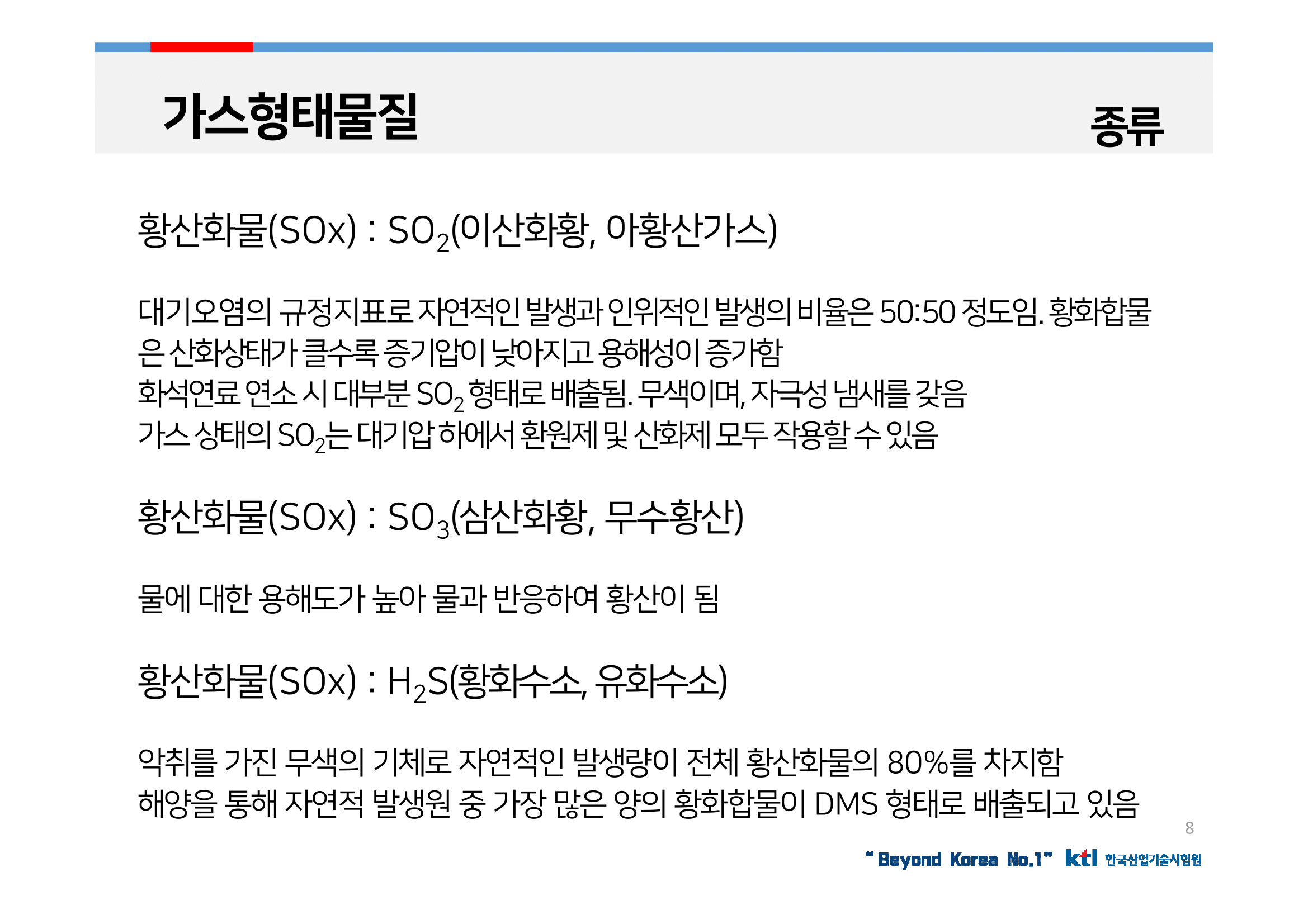대기오염의 규정 지표로 자연적인 발생과 인위적인 발생의 비율은 50:50 정도임. 황화합물은 산화상태가 클수록 증기압이 낮아지고 용해성이 증가함. 화석연료 연소 시 대부분 SO2 형태로 배출됨. 무색이며, 자극성 냄새를 가짐. 가스 상태의 SO2는 대기압 하에서 환원제 및 산화제 모두 작용할 수 있음.