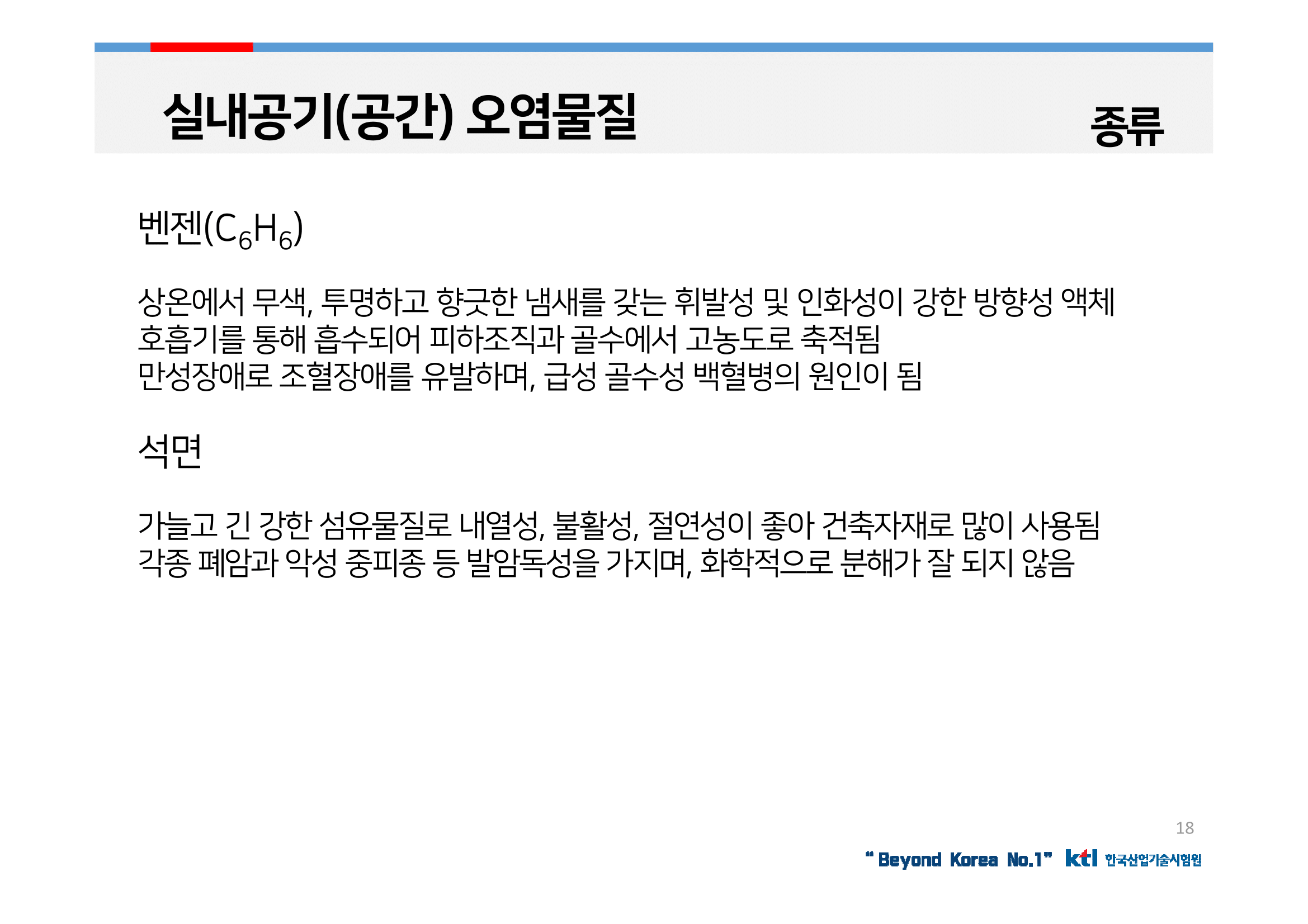 대기중에 휘발하여 악취나 오존을 발생시키는 탄화수소화합물로, 피부접촉이나 호흡기 흡입을 통해 신경계에 장애를 일으키는 발암물질임.