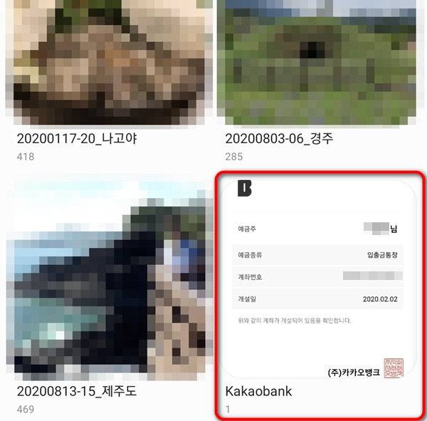 갤러리 앱을 실행하니 Kakaobank 폴더 안에 통장사본 저장된 것을 확인할 수 있습니다. 위 이미지 통장 사본을 이용해 각종 금융 거래에 사용할 수 있습니다.