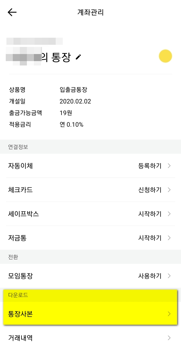 1. "계좌관리 - 다운로드 - 통장사본" 선택하기