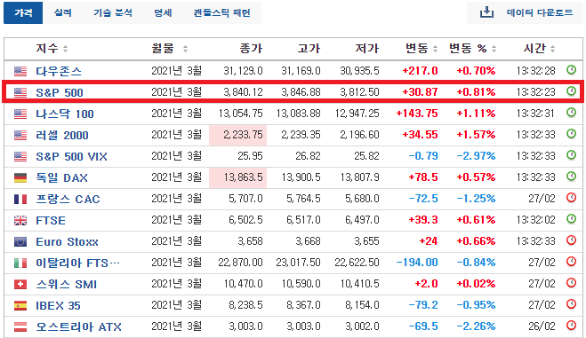 아주 간단하게 클릭 한 번으로 실시간 미선물지수 중 하나인 S&P500을 확인할 수 있네요. 최근 1년 변동률은 30.14%로 양호합니다. 최근 증시에 거품이 끼었고 고점에 이르렀다는 징후들이 하나 둘 나오고 있는데, 향후 1년은 또 어떻게 될지 모르겠군요.