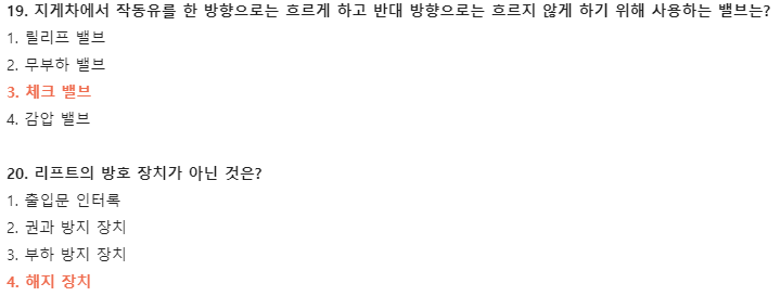 19. 지게차에서 작동유를 한 방향으로는 흐르게 하고 반대 방향으로는 흐르지 않게 하기 위해 사용하는 밸브는?