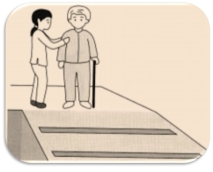 8. 그림과 같이 오른쪽 편마비 대상자가 지팡이를 이용하여 경사로를 내려갈 때 이동 순서는?