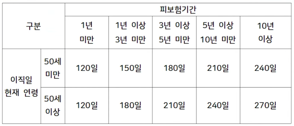 실업급여를 받을 수 있는 기간은 고용보험에 가입되어 있던 기간과 현재 나이를 통해 계산합니다. 본인이 근무했던 기간과 현재 나이를 조합해 확인해 보시기 바랍니다.