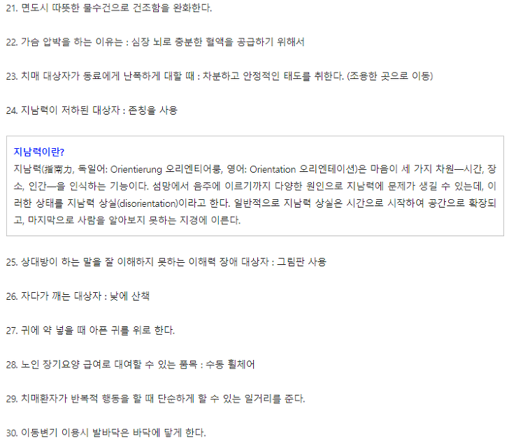 23. 치매 대상자가 동료에게 난폭하게 대할 때 : 차분하고 안정적인 태도를 취한다. (조용한 곳으로 이동)
