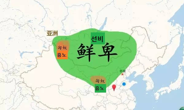 선비족 지도 (한나라~5호16국~위진남북조 초기) 북방 흉노, 동호, 선비, 오환