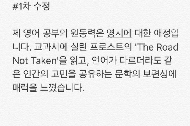 동기: 프로스트의 "The Road Not Taken"을 읽고 영시에 흥미를 느낌. 번역가의 꿈을 가지게 됨