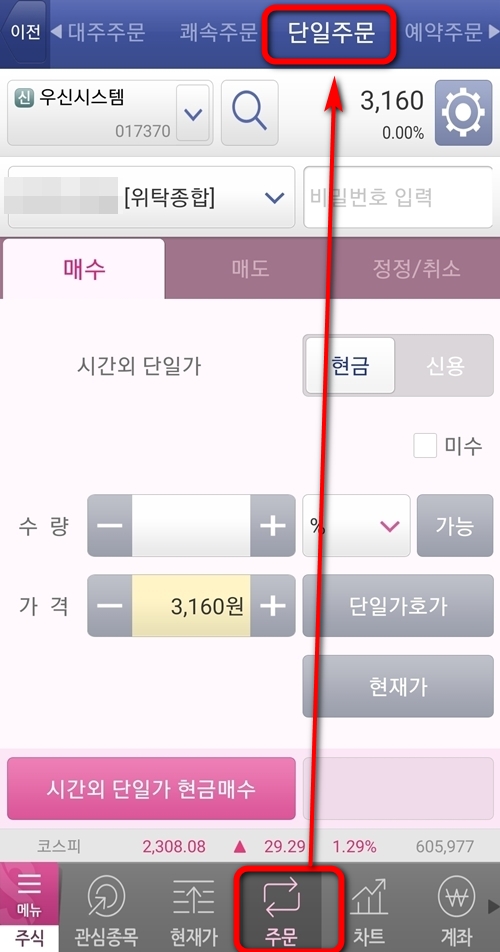 3. 시간외거래 보는법 : "주문" - "단일주문(시간외거래)" (16:00~18:00)