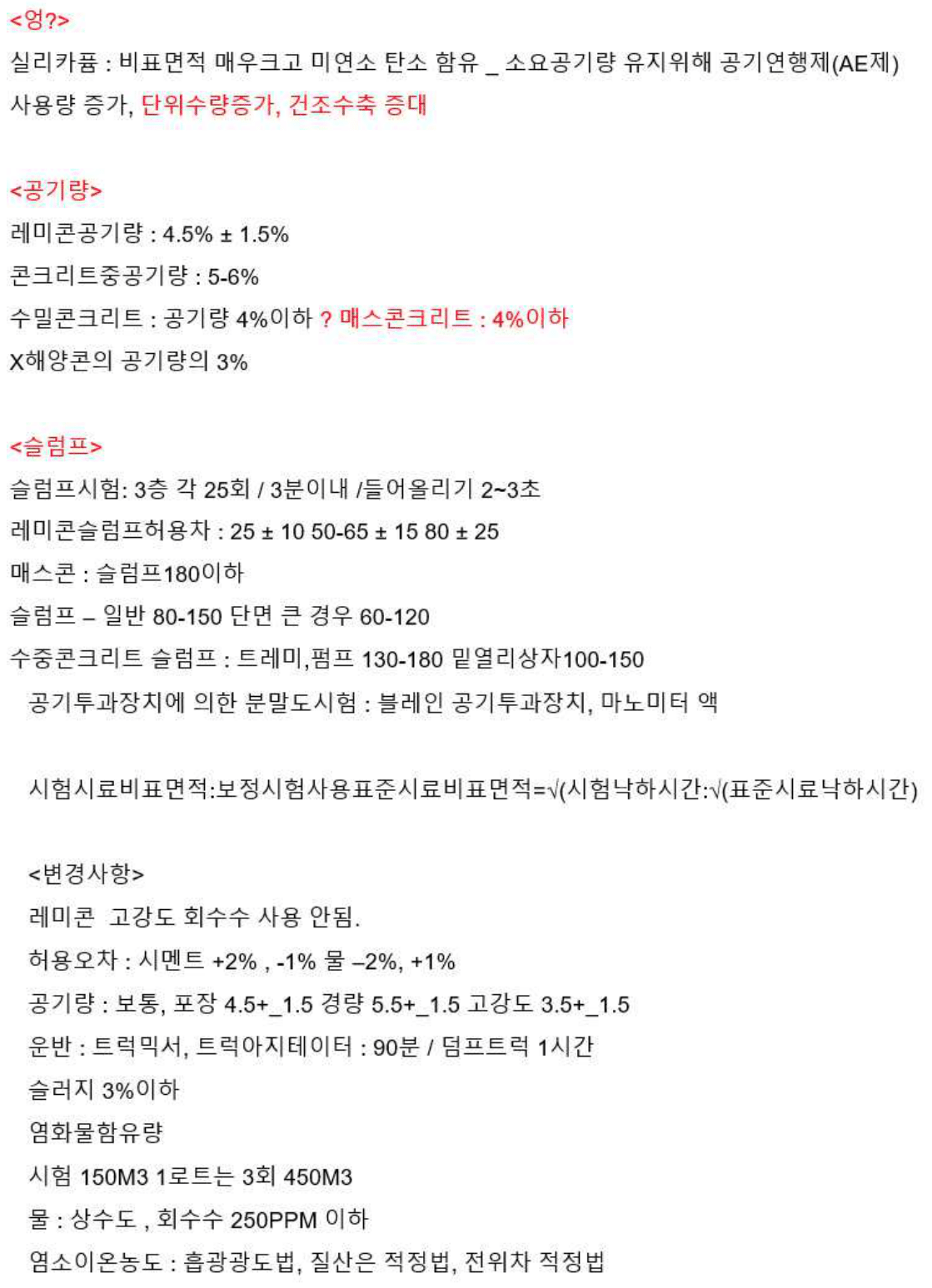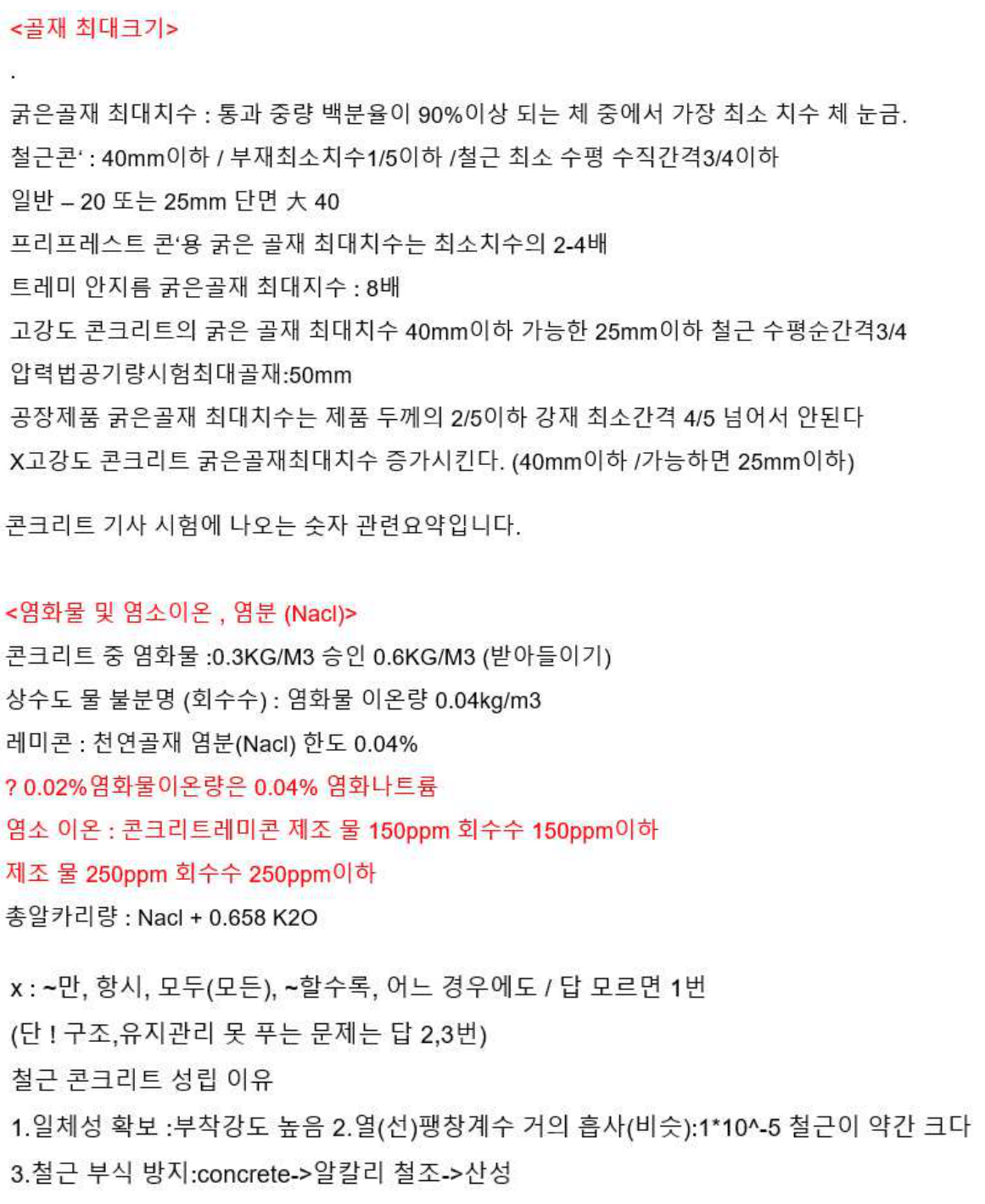 골재 최대 크기, 염화물 및 염소이온, 공기량, 슬럼프 등 숫자 관련 정리 꼭 하시기 바랍니다. 콘크리트 기사 숫자 관련 정리된 파일 소개하고 해당 내용도 이 글에서 모두 확인하시기 바랍니다.