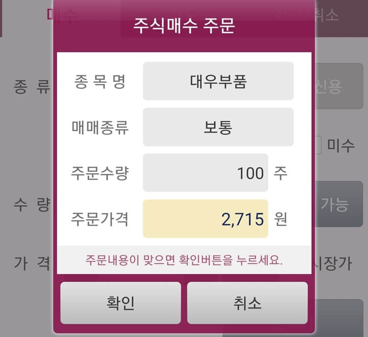 이 기능을 간단히 말씀드리면, 예를 들어 예수금이 1천만원이면, 1/2는 500만원이죠. 대우부품 현재가 또는 매수 넣을 금액 기준으로 500만원에 맞춰 수량이 계산되어 자동 입력되는 겁니다.