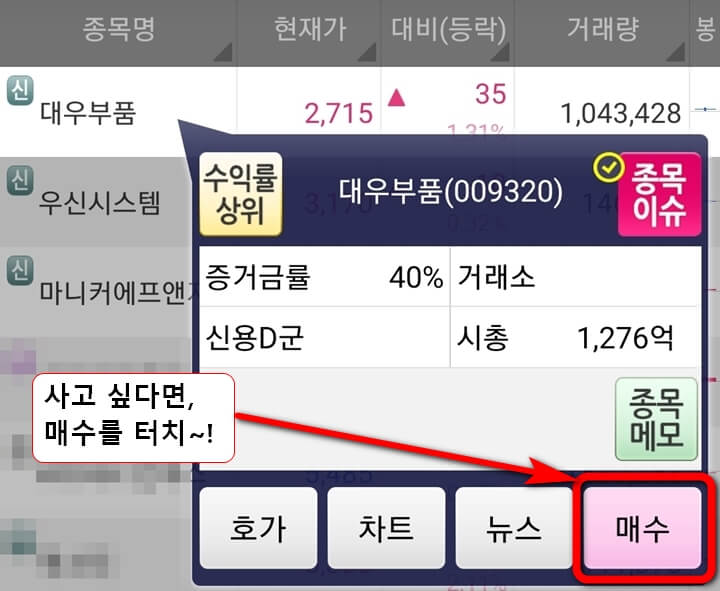 자, 관심그룹 중 대우부품을 선택해 볼게요. 매수 신호를 받았다면 클릭.